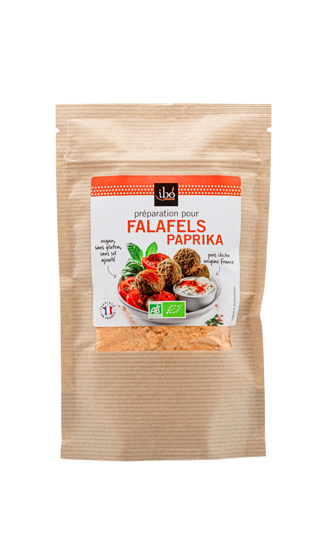 La préparation en poudre pour falafels bio au paprika sans sel Ibo! est la solution idéale pour préparer rapidement des falafels maison au goût authentique. Composée de pois chiches français issus de l’agriculture biologique, elle associe 6 % de paprika bio et un mélange d’épices soigneusement sélectionnées, sans aucun ajout de sel, pour une recette à la fois saine et savoureuse.